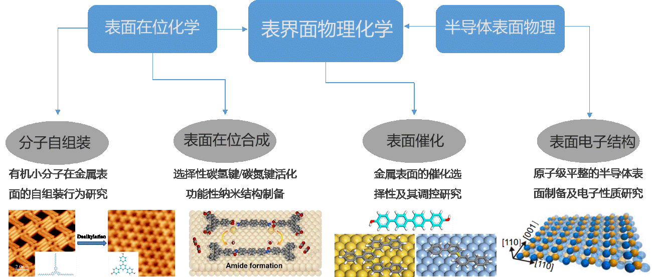 聚焦材料表面物性及催化化学反应等核心问题,使用空间分辨的扫描探针显微镜和化学分辨的光电子能谱作为主要研究手段,以吸附在单晶表面的具有特定官能团的有机分子作为原型体系,在单分子水平开展表面在位化学反应系统研究。