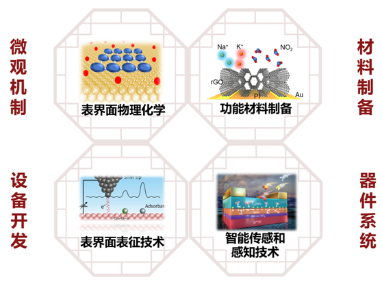 以表界面物理化学为核心,围绕表界面分子科学/表界面智能材料两个方向开展工作。其中表界面分子科学方向主要运用原子力显微镜(AFM)和扫描隧道显微镜(STM)开展表界面物理化学的研究。期望从原子、分子分辨的水平上对功能材料在模型化表界面的组装、结构、性质及在位反应过程做出系统性研究,探索新型碳基功能材料的应用基础。表界面智能材料方向主要聚焦于结构化功能材料表界面、响应性表界面和智能感知器件/系统等研究领域,其研究目标在于发展新型智能材料的精准制备和性质调控方法,并以此基础开展多功能感知和智能传感系统研究。